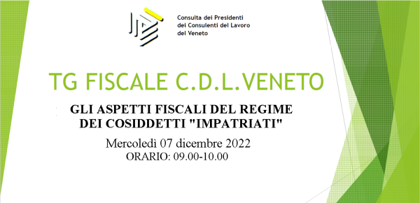DaadminDicembre 15, 2022Mercoledì 07 dicembre 2022 dalle ore 9.00 alle ore 10.00 si terrà un nuovo appuntamento del TG Fiscale CDL Veneto sul tema “GLI ASPETTI FISCALI DEL REGIME DEI COSIDDETTI...