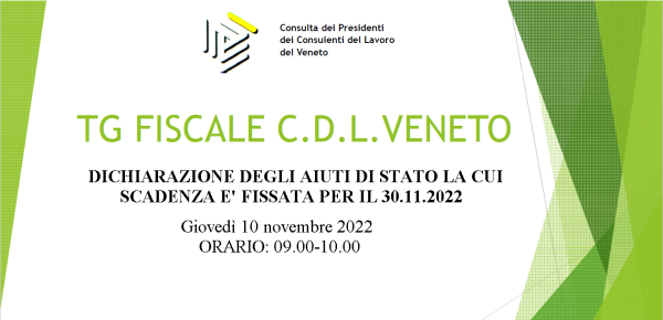DaadminNovembre 16, 2022Giovedì 10 novembre 2022 dalle ore 9.00 alle ore 10.00 si terrà un nuovo appuntamento del TG Fiscale CDL Veneto sul tema “DICHIARAZIONE DEGLI AIUTI DI STATO...