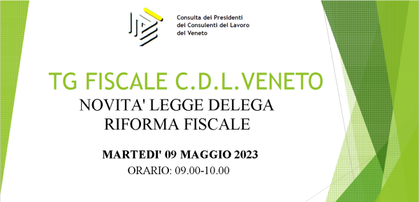 DaadminMaggio 11, 2023Martedì 09 maggio 2023 dalle ore 9.00 alle ore 10.00 si terrà un nuovo appuntamento del TG Fiscale CDL Veneto sul tema “NOVITA’ LEGGE DELEGA RIFORMA FISCALE” organizzato dalla...