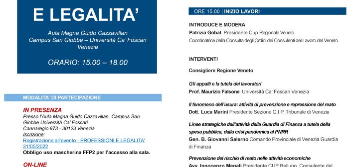 Tutti gli ordini professionali aderenti al Cup Veneto (Comitato Unitario delle Professioni) hanno organizzato il convegno dal titolo “PROFESSIONI E LEGALITA’” che si terrà martedì 31 maggio p.v., con inizio alle ore 15.00, nell’Aula Magna G. Cazzavillan, Campus San Giobbe, dell’Università Ca’ Foscari Venezia, sul tema della legalità e della prevenzione dei reati nell’ambito delle attività economiche. L’argomento verrà affrontato in modo approfondito da relatori istituzionali, del mondo accademico e da professionisti esperti su diversi aspetti che inquinano il corretto svolgimento delle attività economiche e amministrative sia nel privato sia nel pubblico. Fenomeni quali l’usura, gli appalti illeciti, l’antiriciclaggio possono essere intercettati dai professionisti, che possono collaborare con gli organi vigilanti per prevenire e intercettare le situazioni a rischio.
