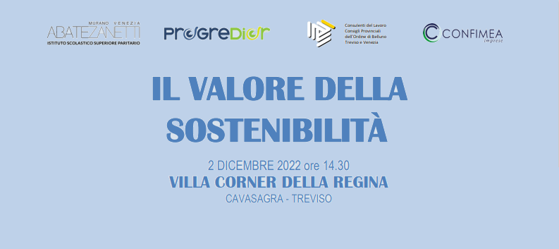 L’Ordine dei Consulenti del lavoro di Venezia, in collaborazione con gli Ordini Provinciali di Belluno e Treviso, ha organizzato il prossimo venerdì 02 dicembre 2022, dalle ore 14.30 alle ore 18.00, un convegno formativo in presenza dal titolo “IL VALORE DELLA SOSTENIBILITA’”, presso Villa Corner della Regina, Via Corriva 10 a Cavasagra TV.
