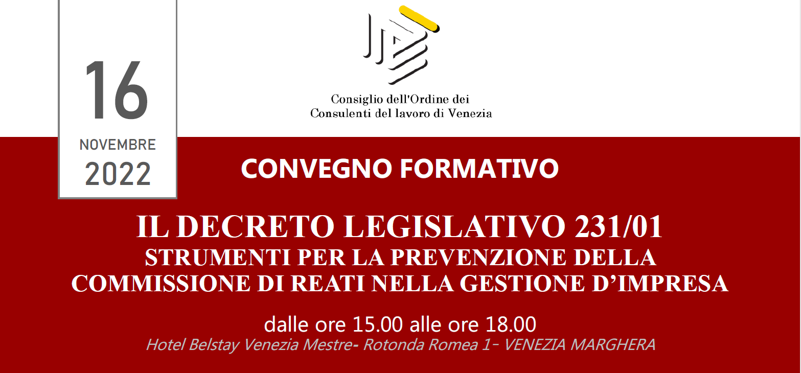 L’Ordine dei Consulenti del lavoro di Venezia ha organizzato il prossimo Mercoledì 16 novembre 2022, dalle ore 15.00 alle ore 18.00, un convegno formativo in presenza dal titolo “IL DECRETO LEGISLATIVO 231/01 – STRUMENTI PER LA PREVENZIONE DELLA COMMISSIONE DI REATI NELLA GESTIONE D’IMPRESA”, presso l’Hotel Belstay Venezia Mestre (ex Holiday Inn), Rotonda Marghera 1, Venezia Mestre.