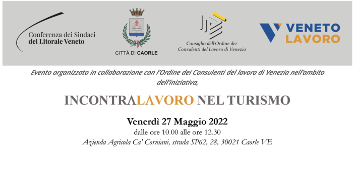 L’Ordine dei Consulenti del Lavoro di Venezia, in collaborazione con Veneto Lavoro, il Comune di Caorle e la Conferenza dei Sindaci del Litorale Veneto, ha organizzato un convegno formativo che si terrà venerdì 27 maggio 2022, dalle ore 10.00 alle ore 12.30, presso l’Azienda Agricola Ca’ Corniani, strada SP62, 28, 30021 Caorle VE dal titolo “INCONTRALAVORO NEL TURISMO“.