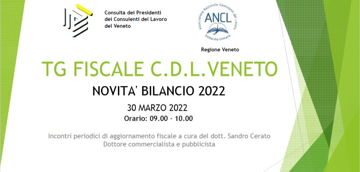 Mercoledì 30 marzo 2022 dalle ore 9.00 alle ore 10.00 si terrà un nuovo appuntamento del TG Fiscale CDL Veneto sul tema “NOVITA’ BILANCIO 2022” organizzato dalla Consulta dei Presidenti dei Consulenti del Lavoro del Veneto e dall’ANCL Regionale del Veneto. L’iniziativa prevede una serie di incontri periodici in materia fiscale della durata di un’ora, in videoconferenza, a cura del dott. Sandro Cerato.