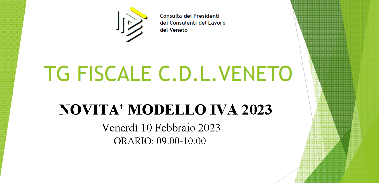 Venerdì 10 Febbraio 2023 dalle ore 9.00 alle ore 10.00 si terrà un nuovo appuntamento del TG Fiscale CDL Veneto sul tema “NOVITA’ MODELLO IVA 2023” organizzato dalla Consulta dei Presidenti dei Consulenti del Lavoro del Veneto. L’iniziativa prevede una serie di incontri periodici in materia fiscale della durata di un’ora in videoconferenza.