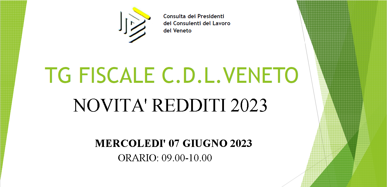 Mercoledì 07 giugno 2023 dalle ore 9.00 alle ore 10.00 si terrà un nuovo appuntamento del TG Fiscale CDL Veneto sul tema “NOVITA’ REDDITI 2023” organizzato dalla Consulta dei Presidenti dei Consulenti del Lavoro del Veneto. L’iniziativa prevede una serie di incontri periodici in materia fiscale della durata di un’ora in videoconferenza.
