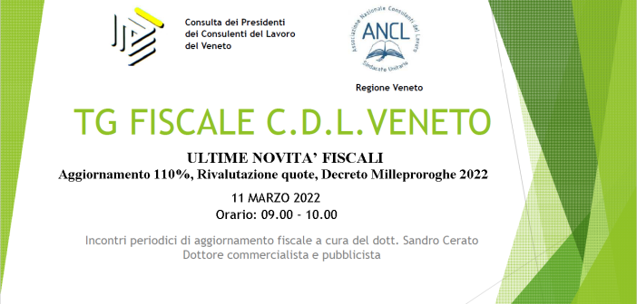 Venerdì 11 marzo 2022 dalle ore 9.00 alle ore 10.00 si terrà un nuovo appuntamento del TG Fiscale CDL Veneto sul tema “ULTIME NOVITA’ FISCALI – Aggiornamento 110%, Rivalutazione quote, Decreto Milleproroghe 2022” organizzato dalla Consulta dei Presidenti dei Consulenti del Lavoro del Veneto e dall’ANCL Regionale del Veneto. L’iniziativa prevede una serie di incontri periodici in materia fiscale della durata di un’ora, in videoconferenza, a cura del dott. Sandro Cerato.